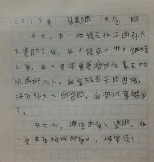 2.同獻愛心共鑄希望背景:2019年9月2日,董事長孫文先生獻愛心資助貧困大學。本次救助的是北塘疃鎮公村一名即將入學的貧困大學生呂某某,他當年參加高考考上了河北東方學院,面對上萬元的學費,這個貧困農家一籌莫展。呂延達這個孩子非常孝順,不愿意父母為自己背上沉重的債務,決定放棄讀大學的機會,外出打工。董事長獲悉后,決心幫他渡過難關,迅速聯系他來鎂神公司,慷慨解囊資助1.5萬,一直幫他完成大學學業。董事長和受到資助的貧困大學生及家長熱情握手并鼓勵說:“小伙子,我就出身廣宗農村,深知上大學的機會來之不易和父母的艱辛,我供你念大學,你好好念書,要奮發努力,將來成為一個對國家、對社會有用的人才,再去回饋社會。”